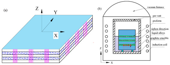 A diagram of a carbon felt infiltration model and the siphon tooling mold. (a) Schematic of 2D needle-punched carbon felts; (b) A schematic view of the siphon tooling mold.