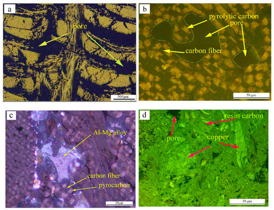 Figure 3a shows that the C/C composites possess numerous matrix crevices, which provides the channels for the liquid alloy. Figure 3b shows the X–Y direction, which is parallel to the liquid alloy direction. Figure 3c illustrates the Y–Z direction, perpendicular to the liquid alloy direction. As shown in Figure 3b, the darker region represents the carbon matrix or carbon fiber, and the carbon fiber is wrapped with pyrolytic carbon.