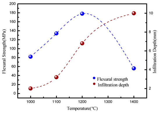 The effect of vacuum heat treatment on flexural strength and infiltration depth (B0, B1, B2, and B4 for 1000, 1100, 1200, and 1400 °C, respectively) of C/C–Al–Mg.