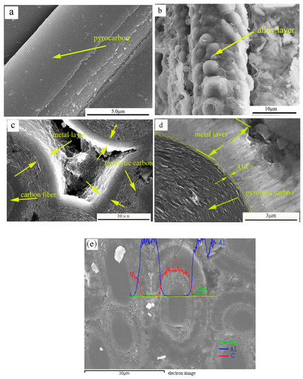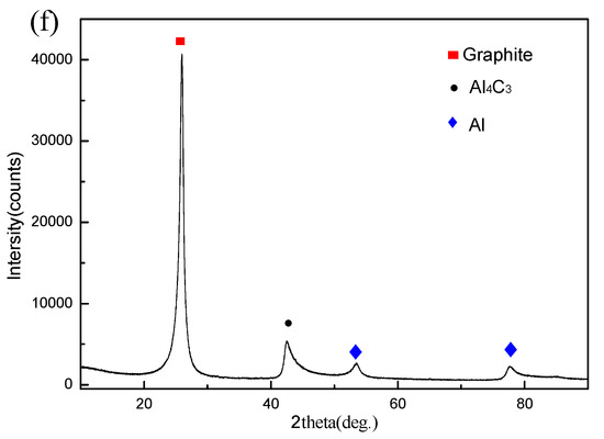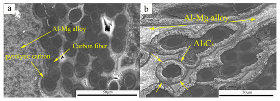 C/C composites exhibit a completely pyrolytic carbon matrix that coats the carbon fibers. The interface between the matrix and fibers represents good adhesion between these materials and modest flexural strength. However, the adhesion between the pyrolytic carbon matrix and carbon fibers increased when pyrolytic carbon fibers were coated with Al or Mg particles and yielded a small quantity of Al4C3, as shown in Figure 10a–d. Figure 10e illustrates the phenomenon of the Al–Mg alloy surrounding pyrolytic carbon. This result can be attributed to the good wettability observed between Al and pyrolytic carbon [37]. For C/C–Al–Mg composites with carbides at the interface, the formation of carbides consumed the C element of carbon fibers, transforming interfacial bonding into chemical bonding from mechanical bonding, as shown in Figure 10f. Finally, the C/C–Al–Mg composites showed increased mechanical properties compared with the C/C composites. After the infiltration of alloy, the carbides of the composites were formed according to the following chemical Equation: