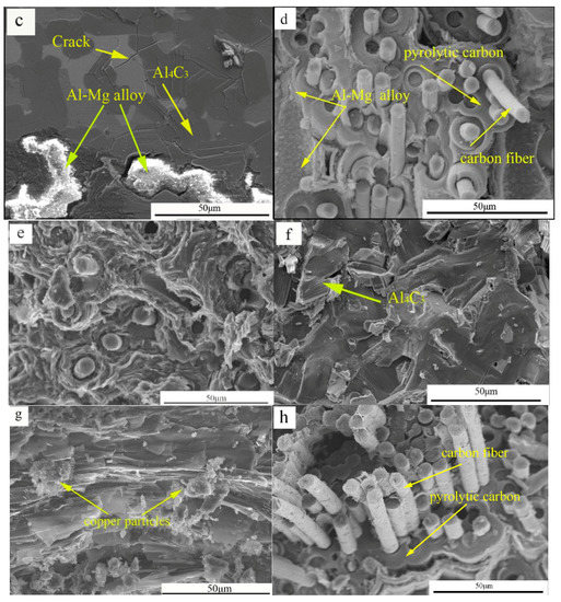 The infiltration depth of the alloy increased monotonically as the heat treatment temperature increased under a constant infiltration time. The bending properties of the material reached a maximum at 1200 °C. The flexural strength had a 183 MPa load in the Z-direction, and the infiltration depth was approximately 6.80 mm. With the above experimental results, the wettability of the material improved by increasing the heat treatment temperature. When the reaction temperature exceeded 1200 °C, the mechanical properties of the material decreased significantly. Therefore, for infiltration, the optimum reaction temperature is 1200 °C. Figure 5a,d show the loose and porous microstructure of C/C–Al–Mg and its generally poor mechanical properties. Figure 5b,e illustrate the compact microstructure of C/C–Al–Mg and its excellent mechanical properties. The bending properties totaled 183 MPa, and the compression performance approximated 206 MPa. Figure 5c,f show that the microstructure of C/C–Al–Mg changed. The material mainly comprised Al4C3 and Al–Mg alloy. Consequently, the mechanical properties of the material decreased rapidly. Figure 5g shows the weak flexural strength of the steeped metal slider composites and its brittle characteristic. A small amount of copper particles was observed in the fracture morphology assessment. This phenomenon can be attributed to the lack of carbon fiber in the matrix during the fracture process [26]. Figure 5h shows the fracture micrographs of the C/C composite, with many fibers or fiber bundles pulled out. Obviously, adding elements can improve the mechanical properties of the composites. What is more, with an increase in temperature, the wettability of the composite can be improved [27,28].