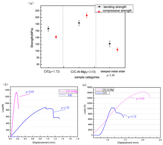 Figure 5e shows the C/C–Al–Mg material bending fracture with carbon fibers pulling out or debonding and with fiber lengths at the micron level. Furthermore, the carbon fiber debonding results in cracks or holes. The extraction of pyrolytic carbon and Al–Mg alloy on the surface of carbon fiber shows that the penetration of aluminum also improves the bonding strength between the matrix and carbon fiber. The interfacial bonding strength of aluminum and carbon was stronger than that of C/C materials, which resulted in a shorter pullout length of the carbon fiber [29]. The difference in the interfacial bonding strength between C/C and C/C–Al–Mg can be attributed to the good wettability of aluminum and the improved strengthening effect of the matrix, resulting in enhanced fracture stress. However, the flexural strength of C/C measured 165 MPa, whereas the flexural strength of C/C–Al–Mg was 183 MPa, loaded in the Z-direction, as shown in Figure 6a. The compressive strength of C/C and C/C–Al–Mg reached 142 and 206 MPa, respectively. Nevertheless, smooth surfaces were observed for pitch coke, as shown in Figure 5g, and only a small quantity of the copper particles of the matrix was displayed. The flexural strength of the steeped metal slider material reached 121 MPa. Compared with the industrial standard, the bending strength of the pantograph was more than 80 MPa higher, and C/C–Al–Mg was able to meet the requirements of the pantograph material. Figure 6a shows that the compressive strengths of C/C–Al–Mg and the steeped metal slider material totaled 206 and 104 MPa, respectively. Finally, the results showed that C/C–Al–Mg possesses better mechanical properties than the steeped metal slider.