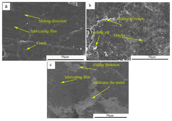 The materials between the worn surface and micro-cracks peeled off. Peeling pits were formed, as displayed in Figure 8b. Mechanical and thermal stresses were continuous between contact asperities under constant load, implying the relationship of localized fatigue phenomena to the displacement of areas. These cyclic fatigue phenomena caused the material to generate peeling pits. When the alloy was infiltrated into the C/C composites, the lubricating film contained metal particles. Some metal particles increased the hardness of the lubricating film, and other metal particles fractured or loosened from the matrix. Accordingly, numerous particles of large wear debris were scattered on the worn surface, contributing to severe abrasive wear. A few peeling pits and cracks were also observed on the worn surface, suggesting a mechanism for adhesive wear.