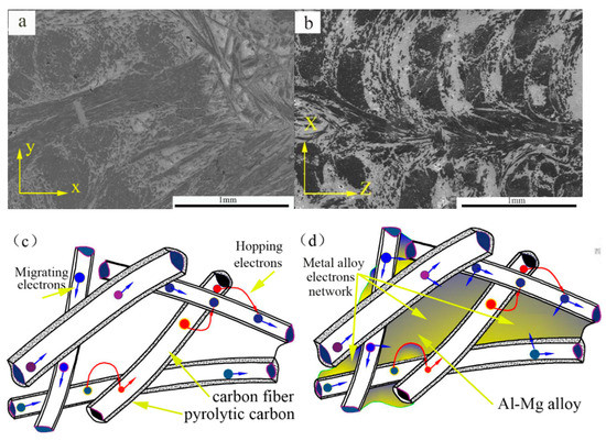 Microstructure and conduction mechanisms of C/C–Al–Mg. (a,b) SEM micrographs of C/C–Al–Mg and a schematic diagram of the conduction mechanism; (c) Initial conditions; (d) Impregnation metal conditions.
