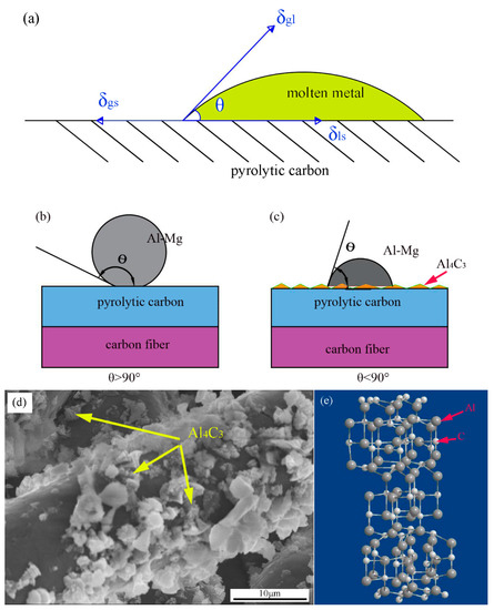 As shown in Figure 11a, a relationship was observed between the wetting angle of infiltration and tension. As shown in the figure, θ is called the wetting angle. The equilibrium value of the contact angle (θ), which is used to define the wetting behavior of liquids, obeys the classical equation of Young (see Equations (9) and (10)). In the experiment process, Al-pyrolytic carbon systems produced a small quantity of Al4C3, and the interface reaction product promoted wetting, as shown in Figure 11b,c. Over the last few decades, several studies have investigated the wetting behavior of Al-pyrolytic carbon systems. As a reactive wetting system, the final or steady contact angle should be equal to or close to the equilibrium contact angle of the liquid on the reaction product, Al4C3. The wetting behavior of the reaction product is governed by the formation of adsorption layers at the interface, rather than by the subsequent nucleation and growth of the reaction product [38]. The wettability will not be improved by the chemical reaction itself. Chemical reactions involve an exchange of atoms. Consequently, in the Al-pyrolytic carbon system, the final contact angle on the reaction product, Al4C3, is lower than the initial contact angle on the original substrate, graphite, as shown in Figure 11c,d. Moreover, a crystal structure also affected the shape of Al4C3 (Figure 11e). The crystal structure of Al4C3 was constituted by the layers of Al and C, which are alternately stacked on each other. This kind of structure was also observed in carbon nanotube-reinforced aluminum silicon composites (Srinivasa et al., 2009). The reaction of aluminum and carbon is complex in the process of infiltration. It is necessary to research the reaction mechanism involved in the process of infiltration. Some scholars believe that the reaction is controlled by the formation of particles of carbide at the interface, which prevents the reaction from proceeding [39,40,41].