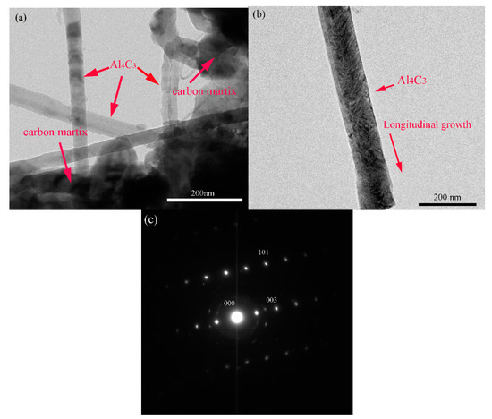 During the growth process, Al4C3 formed a needle-like morphology on the surface of pyrocarbon, as shown in Figure 12b. Finally, the main growth direction of Al4C3 was longitudinal [48]. The longitudinal growth speed of Al4C3 was controlled by diffusion and Ostwald ripening [49]. The Ostwald ripening process is confirmed by the significant change in the Al4C3 particle size. The diffusion speed was affected by the diffusion of not only the elements in the matrix, but also by Al and C in Al4C3 [50]. The lateral growth speed was mainly controlled by two-dimensional nucleation, which formed at the interface. The different growth speeds made the shape of Al4C3 a needle-like microstructure. Figure 12b showed the TEM photos of the microstructure of Al4C3, which was 567.9 nm in length and 110.8 nm in width. The ratio of length to width was about 6.38. It had the tendency to grow in thickness in the direction of the end portion. Figure 12c shows the end portion of Al4C3.