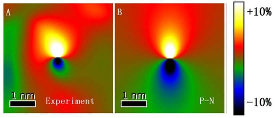 Experimental (a) and theoretical (b) strain fields around the edge component from a 60° dislocation core on a Ge/Si interface. Adapted from Liu et al. [15].