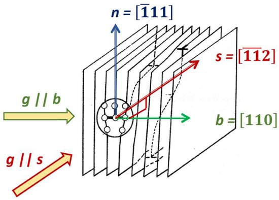 The displacement field around a dislocation is anisotropic (Figure 1). This is readily observed in transmission electron microscopy (TEM) imaging of dislocations, whereby rotating the sample so that a dislocation’s Burgers vector (b) is perpendicular to the diffraction vector, g, gives a vanishing contrast. The modelling of a dislocation’s displacement field is an important method used within TEM to be able to identify details of dislocations [15,16], especially in cases when g.b=0 does not lead to vanishing contrast or due to practicalities of rotating a sample. In the same manner, the diffraction broadening caused by a dislocation varies depending on the diffraction vector, and can be calculated by modelling the dislocation’s displacement field. The contribution of a dislocation’s displacement field to the broadening of different diffraction profiles is through what is known as the contrast (or orientation) factor of dislocations. The contrast factor of an individual dislocation is dependent on the angles between the diffraction vector and the vectors that define the dislocation: it’s Burgers vector (b), slip plane normal (n), and dislocation line (s). The contrast factor of an individual dislocation can be calculated using the computer program ANIZC [17]. For example, the edge dislocation in Figure 2 has a contrast factor of 0.46 when g is [110] and parallel to the dislocations Burgers vector. The value is 0.00 when g is parallel to the slip line () and 0.05 when g is parallel to the slip plane normal ().