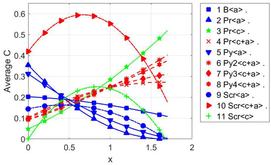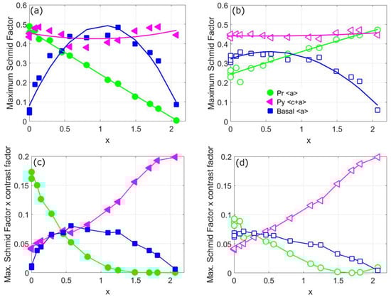 The change in the average contrast factor for the most common slip systems of titanium at different x values. The q values of the slip systems are detailed in Table 1. Adapted from Dragomir and Ungar [30].
