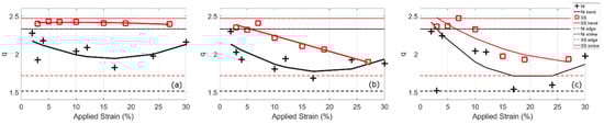 The change in q with applied strain of compression tested nickel and stainless-steel alloys. The lines indicate the predicted values for 100% edge and 100% screw dislocations for the two alloys using Equation (2) and ANIZC [17]. The different figures represent results using different modified Williamson-Hall methods; in the terminology of Simm et al. (a) is mWH-1, (b) mWH-2, and (c) mWH-3.
