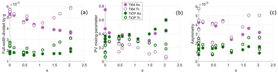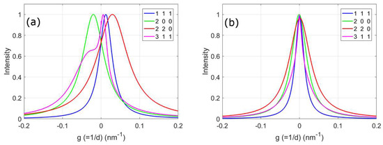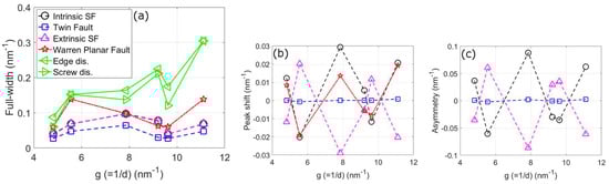 Reformulated values of ϖhkl used in Equation (4) and Χhkl used in Equation (5) using Balogh’s approach are shown in Table 3. These values along with the accompanying equations provide an additional way to use the approach of Balogh et al., in addition to its part of the MWP procedure [36]. From this table and Figure 6, it can be seen that the approaches of Warren and Balogh et al. provide similar but markedly different results. Note that Warren’s formula for broadening (Equation (4)) uses both intrinsic and twin faults, whereas the peak shift formula (Equation (5)) only uses intrinsic faults. The broadening from stacking fault and twin fault using the approach of Balogh et al. are similar, but stacking faults cause more broadening. The magnitude difference of twin and stacking faults is consistent with Warren’s formula in Equation (4) where stacking faults contribute 1.5 times the broadening of twin faults. Warren’s formula gives a greater broadening of the 200 peak than with Balogh’s approach, but the broadening of other peaks is closer. The peak shift changes are relatively close for the two approaches, particularly for 111 and 200 peaks. The biggest difference in the approaches is for asymmetry. Whereas, the work of Warren suggested that only twin faults should cause asymmetric peaks, this is the opposite of that found using Balogh’s approach. Warren only defined asymmetry in terms of the 200 peak and commented that it is not possible to determine fault probability accurately from peak asymmetry, and is therefore not included in the figure.