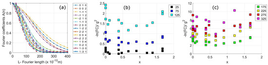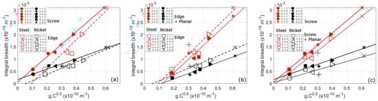 Modified Williamson-Hall plots of integral breadth against gC0.5 for nickel and stainless-steel samples deformed to 10% applied strain. In (a) plots for different values of q of 1.5 (approximately edge) and 2.5 (approximately screw) using Equation (2). In (b,c) shows the effect of planar faults on the values in (a). The integral breadths are reduced by broadening from planar faults from Equation (4) of , using a nominal value of . Straight lines have been fitted to the integral breadth against gC0.5 for the different sets of values. The root-mean-squared-error (rmse) values for each of these are shown in Table 4. The data is for neutron diffraction measurements taken at HRPD, ISIS, Oxfordshire taken from [3]. The values are averaged over angles between the compression and diffraction vectors, between 0 and 90°.