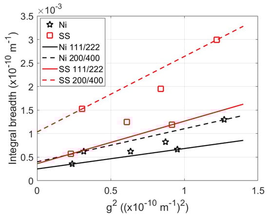 In Figure 9 are Williamson-Hall plots of the same nickel and stainless-steel samples, compression tested to 10% applied strain, used above. The lines in the plot are Williamson-Hall fit lines (using g2 against FW) for the 200/400 and 111/222 peaks of the alloys. The values of and are the intercepts of the lines in this figure.