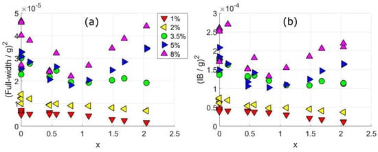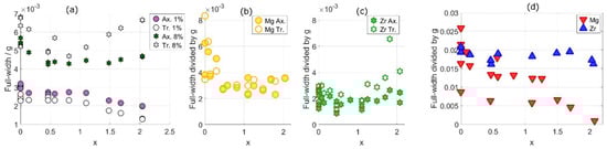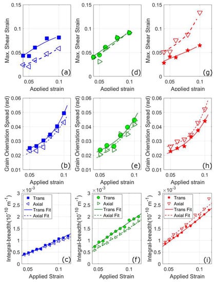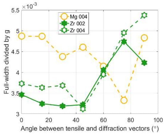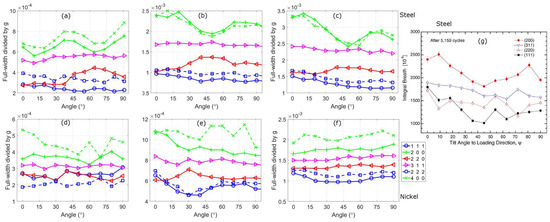 The measured full-width divided by g of a stainless steel (a–c) and nickel alloy (d–f) after compression testing, at different angles between the compression direction and the diffraction vector [3,42]. The figures are at increasing applied strain. For stainless steel the figures are at (a) 2%, (b) 10%, and (c) 16% applied strain. For nickel, the figures are at (a) 2%, (b) 10%, and (c) 30% applied strain. In (g) the integral breadth divided by g of a stainless steel alloy after fatigue testing, at angles between the tensile and diffraction vector [27]. The instrumental broadening has been subtracted from the measured values. In (g) are changes in the integral breadth (a function of FW and the shape of the tail of the peak) of a stainless steel after fatigue testing taken from Wang et al. [27].