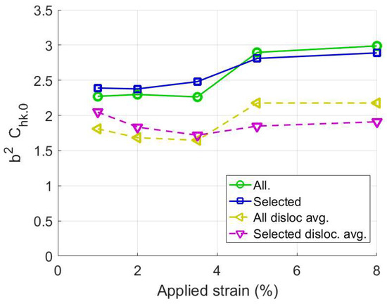 Whereas, in cubic alloys the value of the constant is very similar for edge and screw dislocations, in HCP alloys the corresponding constant can vary significantly for different slip systems. Therefore, in HCP alloys the contrast factor cannot just be a fitting variable, because it is needed to evaluate the dislocation density. This can be seen from Equation (1), which shows a feature of DPPA methods that they can only obtain the product and not the values individually. The homogeneous contrast factor approach has been widely used in HCP alloys to quantify the fraction of dislocations with different Burgers vectors [3,22,29,30,31,32,33]., or relative amounts of slip systems with different slip planes [3,30].