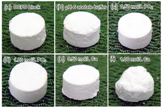 Figure 1 shows the typical photographs of (a) the DCPD block, as well as the block after immersion in (b) a pH-6 acetate buffer solution, (c) a 0.5 mol/L PO4 solution, (d) a 1.0 mol/L PO4 solution, (e) a 0.5 mol/L Ca solution, and (f) a 1.0 mol/L Ca solution, at 70 °C for two days. The DCPD blocks maintained their shapes during the solution immersion treatment, except for the case of immersion in the pH-6-adjusted 1.0 mol/L Ca solution.