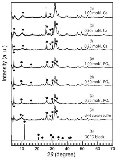 XRD patterns of DCPD block (a) before immersion and (b) after immersion in pH-6 acetate buffer solution, as well as after immersion in the same solution containing (c) 0.25-mol/L PO4, (d) 0.50-mol/L PO4, (e) 1.00-mol/L PO4, (f) 0.25-mol/L Ca, (g) 0.50-mol/L Ca, and (h) 1.00-mol/L Ca. ●: DCPD (PDF card No. 11-293), ◆: octacalcium phosphate (OCP) (PDF card No. 26-1056), ▼: hydroxyapatite (HAp) (PDF card No. 55-592), and ■: dicalcium hydrogen phosphate anhydrate (DCPA) (PDF card No. 9-80). ↓ indicated unidentified peaks (HAp or OCP).