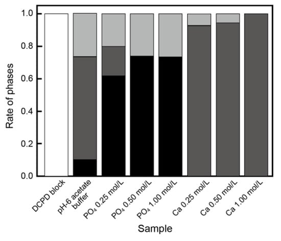 Phase rate of calcium phosphate yields in the samples. White: DCPD. Light grey: DCPA. Dark grey: HAp. Black: OCP.