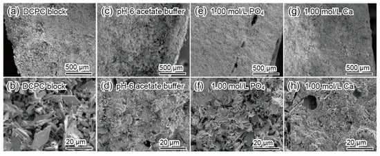 SEM images of the DCPD block (a,b) before immersion and after immersion in a (c,d) pH-6 adjusted solution, (e,f) pH-6 adjusted 1.00 mol/L PO4 solution, and (g,h) pH-6 adjusted 1.00 mol/L Ca solution, each at 70 °C for 2 days.