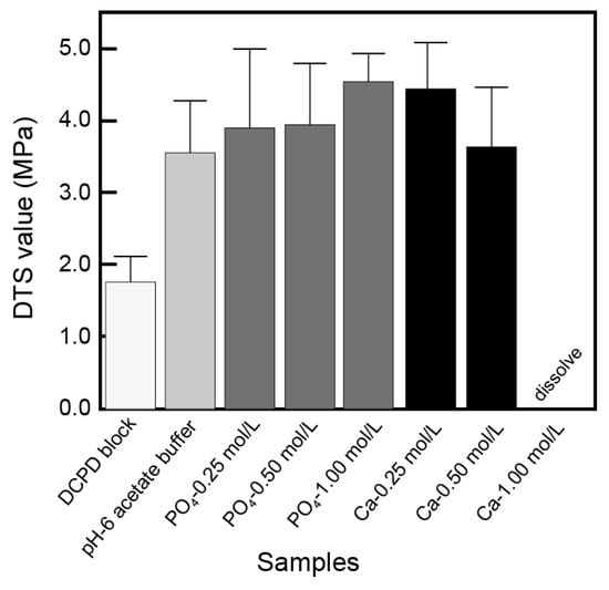 Figure 5 shows DTS values of the DCPD block and the block after immersion in the pH-6 buffer, PO4, and Ca solutions at 70 °C for two days. Although after treatment the DTS values of the samples were significantly higher than those of the DCPD block, there was no significant difference among all the treated samples, except for the DCPD block immersed in the 1.0 mol/L Ca solution, which could not maintain its shape.