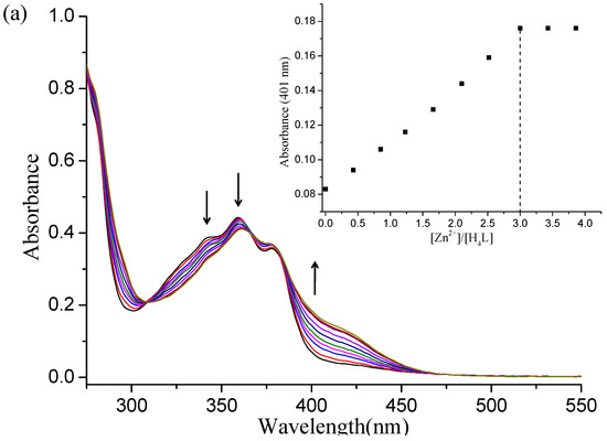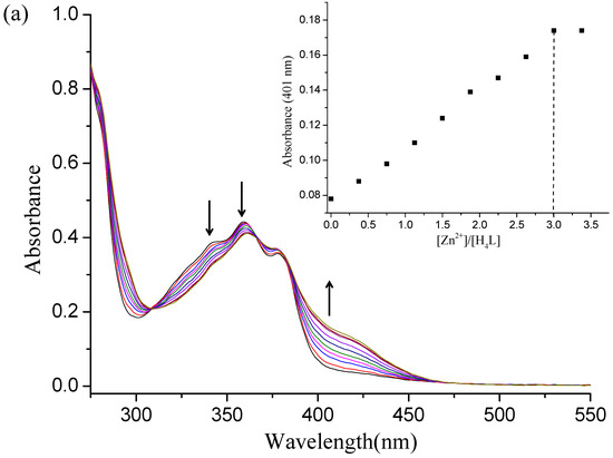 In the UV–Vis titration test, gradual addition of Zn(OAc)2 to H4L solution resulted in solution changes from yellow to colorless. In contrast to H4L, the peaks are bathochromically shifted. This phenomenon is owing to the reaction of H4L with ZnII ions. When ZnII ions were added in excess of 3 equiv, the absorbance no longer changed. The spectroscopic titration of H4L and Zn(OAc)2 obviously showed a 1:3 homo-trinuclear complex was formed which is shown in Figure 1a.