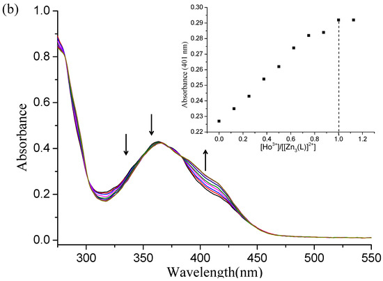 (a) UV-Vis spectral changes of H4L (1.0 × 10−5 M) upon the addition of ZnII (1.0 × 10−3 M) ions; (b) UV-Vis spectral changes of [LZn3]2+ upon the addition of HoIII (1.0 × 10−3 M) ions.