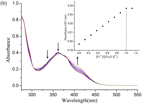 (a) UV–Vis spectral changes of H4L (1.0 × 10−5 M) upon the addition of ZnII (1.0 × 10−3 M) ions; (b) UV–Vis spectral changes of [LZn3]2+ upon the addition of ErIII (1.0 × 10−3 M) ions.