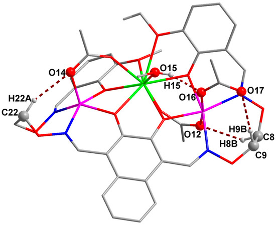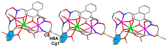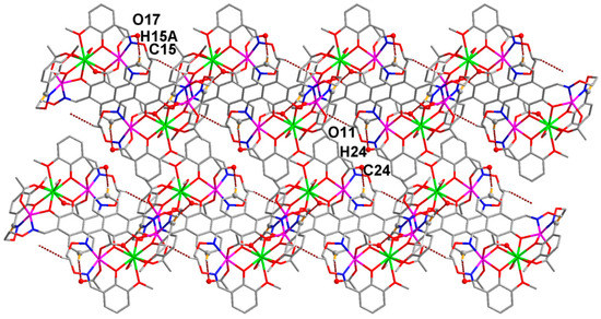 The hydrogen bonding and C-H···π interactions are summarized in Table 4. In the structure of complex 1, there are four pairs of intra-molecular O15-H15···O16, C8-H8B···O12, C9-H9B···O17 and C22-H22A···O14 hydrogen bonding in Figure 4 [69,70,71,72,73,74]. As illustrated in Figure 5, a 2D supra-molecular structure is interlinked via two significant intermolecular C15-H15A···O17 and C24-H24···O11 hydrogen bonding interactions are constructed. In addition, one significant C-H···π interaction (C8-H8A···Cg1 (C25-C30)) is built in Figure 6 [75,76,77,78].