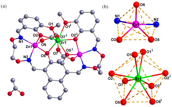 (a)The crystal structure of complex 2; (b) Coordination polyhedrons for ZnII and ErIII atoms.