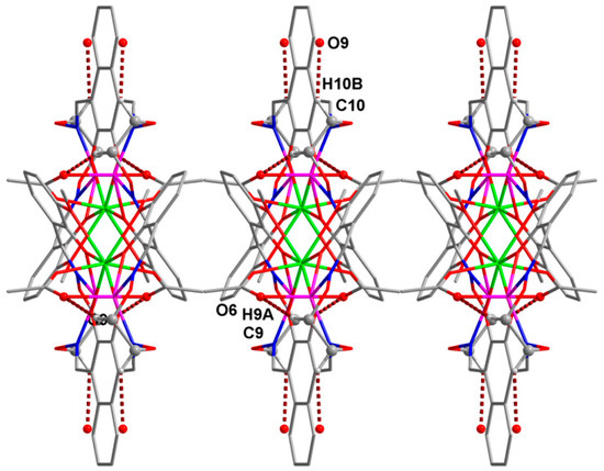 The hydrogen bonding and π···π interactions are summarized in Table 6. In the structure of complex 2, there is one pairs of intra-molecular C9-H9A···O6 hydrogen bonding and one significant intermolecular C10-H10B···O9 hydrogen bonding interactions in Figure 8. As illustrated in Figure 9, the space skeleton of complex 2 adopts a 3D supra-molecular structure by the hydrogen bonding and π···π stacking interactions [71,72,73].