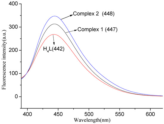 The emission spectra of H4L in CH3OH:CHCl3 (v/v = 1:1) solution and its corresponding metallic complexes 1 and 2 in methanol solution were measured in detail. As shown in Figure 10, H4L exhibited an emission peak at ca. 442 nm upon excitation at ca. 350 nm, which could be attributed to the intra-ligand π-π* transition [59]. Whereas, upon excitation at ca. 350 nm, complexes 1 and 2 showed relatively strong emission peaks at about 447 and 448 nm, respectively. These relatively intense emission peaks are bathochromically shifted, which could be assigned to ligand-to-metal charge transfer (LMCT) transitions [62,65].