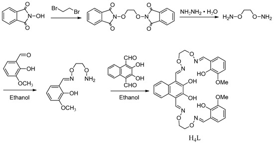 2,3-Dihydroxynaphthalene-1,4-dicarbaldehydeand 2-[O-(1-ethyloxyamide)] oxime-6-methoxyphenol were prepared according to the early reported methods [64,66]. The synthesis of H4L and its complexes is depicted in Scheme 1.