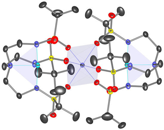 Thermal ellipsoid plot of the dimeric Co2+ complex, [(Co(Ts3tren))Mg(Co(Ts3tren))]. Thermal ellipsoids are shown at the 79% probability level.