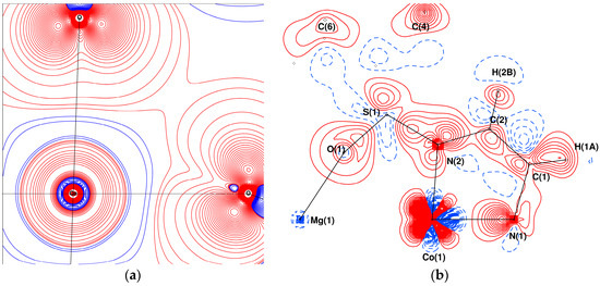 The contour map of the Laplacian operators of electron density of MgL2, displayed in Figure 2, showed the spherical distribution of charge concentration within the valence shell of the magnesium atom. It was also possible to observe the polarization of the valence shell of the cobalt metal center, with the charge depletions directed toward the charge concentrations of the nitrogen atoms. An interesting feature of the molecular graphs was the interatomic region between the magnesium and cobalt atoms, where an axial charge depletion of the cobalt valence shell faced a (3, +3) critical point, which was a local minimum of the electron density. This feature was also observed in the other complexes (Table 3).