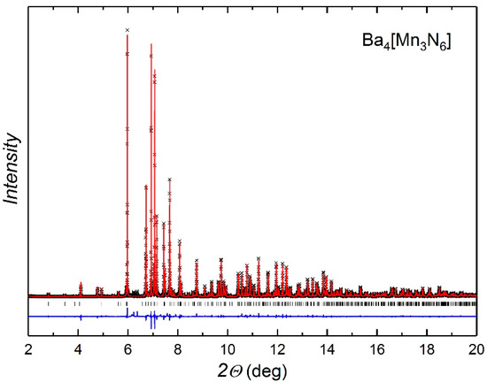 Synchrotron PXRD pattern of Ba4[Mn3N6] (λ = 0.35434 Å) with experimental points shown in black, calculated pattern after Rietveld refinement in red, and difference curve in blue. Tick marks denote the calculated positions of Bragg reflections.