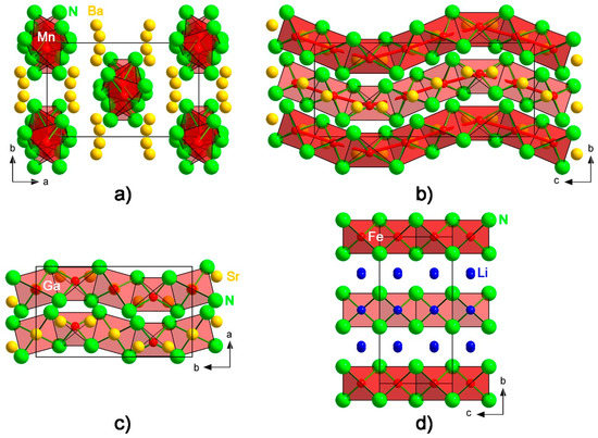 - Tennstedt, A.; Röhr, C.; Kniep, R. Sr3[MnN3] and Ba3[MnN3], the First Nitridomanganates(III): Trigonal-Planar Anions [MnIIIN3]6−. Z. Naturforsch. B 1993, 48, 794–796. [Google Scholar] [CrossRef]