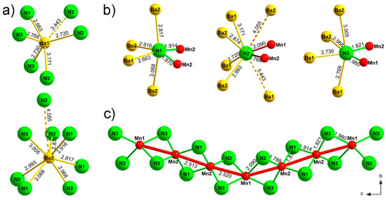 Ba1 and Ba2 atoms are (5 + 1)-fold and (7 + 1)-fold irregularly coordinated, respectively (Figure 3a). For Ba1, the five shortest Ba–N bonds range from 2.66 Å to 3.17 Å. The resulting [Ba1N5] entity resembles a distorted square pyramid, similar to the corresponding coordination polyhedron in another barium nitridomanganate, Ba3[MnN3] [32]. The sixth nitrogen atom is located at a relatively longer distance of 3.44 Å, thereby completing the (5 + 1)-fold coordination environment. Ba2 is coordinated by seven N atoms at distances of 2.82–3.07 Å and a further one at 4.06 Å. These distances are in good agreement with the typical values found in other nitridometalates containing Barium [24,27,29,32].