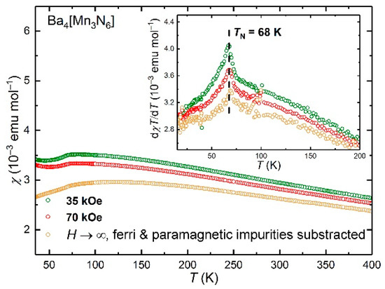 Magnetic susceptibility of Ba4[Mn3N6] versus temperature is given in Figure 5. The observed weak field dependence points to a possible ferro- or ferrimagnetic impurity, most likely ferrimagnetic Mn4N (TC = 740 K) [36]. In this case, the impurity amounts to less than 0.4 mass% as can be estimated from the magnetization data. Due to the small amount, Mn4N was not observed in the PXRD pattern of the sample under study.