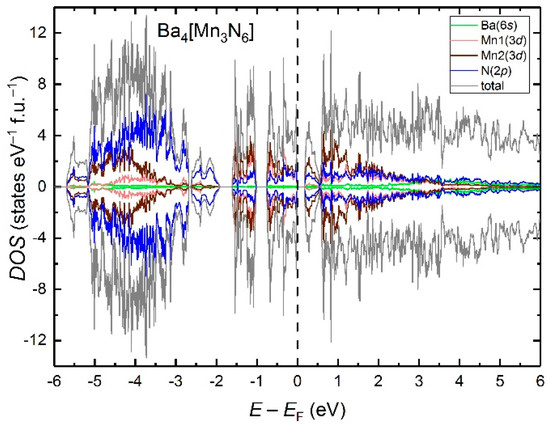 Interestingly, metal-metal bonding was discussed as a reason for quenching of magnetic moments in certain nitridometalates, e.g., Ca12[Mn19N23] [47], Sc[TaN2] [48], Li6Sr2[Mn2N6] [49] and Ca6[Cr2N6]H [10]. If all adjacent Mn atoms in Ba4[Mn3N6] are linked by 2c–2e bonds, the resulting magnetic moment on every Mn atom will be lowered by 2 μB in comparison with the spin-only value. This is in line with the magnetic moments obtained from our LSDA calculations. Therefore, it can be speculated that the reduced magnetic moments for the Mn species are intrinsic to Ba4[Mn3N6] and stem from the chemical bonding between Mn atoms (Figure 8). The development of the Mn–Mn bonding in Ba4[Mn3N6] is reflected in a much shorter Mn–Mn distance (2.5 Å) in comparison with that in the structurally similar oxomanganates K5[Mn3O6] and Rb8[Mn5O10] with d(Mn-Mn) = 2.7–2.8 Å, which demonstrate the expected magnetic moments on Mn sites [41,42].