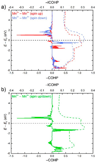 COHP curves for the Mn–Mn nearest neighbor interactions in Ba4[Mn3N6]: (a) Mn2+–Mn4+; (b) Mn4+–Mn4+. For symmetry reasons, the COHP curves for the Mn4+–Mn4+ spin up and spin down contacts overlap.