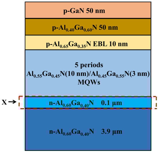 To reveal the impact of different Si doping concentrations on the electric field profile within the n-Al0.60Ga0.40N depletion region and the corresponding carrier injection efficiency, we designed DUV LED devices, as shown in Figure 1. The electron source layer was a 4 μm thick n-Al0.60Ga0.40N layer and the effective electron concentration was set to 1.0 × 1018 cm−3, except for the region labeled as “X region” in Figure 1. The X region has different Si doping concentrations for the DUV LEDs, i.e., the 0.1 μm thick X region had electron concentrations ranging from 9.0 × 1016 cm−3 to 4.0 × 1020 cm−3. The active region for all three DUV LEDs contained five periods of Al0.45Ga0.55N/Al0.55Ga0.45N MQWs, with a well thickness and barrier thickness of 3 nm and 10 nm, respectively. Then, a 10 nm thick p-Al0.65Ga0.35N EBL, with the effective hole concentration of 7.0 × 1016 cm−3, was adopted on top of the MQWs. The p-EBL was then followed by a 50 nm thick p-type Al0.40Ga0.60N layer, with an effective hole concentration of 9.0 × 1016 cm−3. Lastly, a 50 nm thick p-GaN layer, with an effective hole concentration of 1.0 × 1017 cm−3 was caped on the p-type Al0.40Ga0.60N layer. The mesa size for the three devices was set to 350 × 350 μm2.