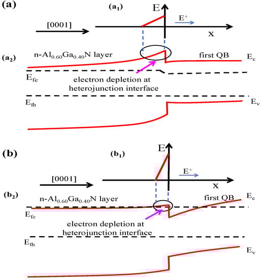 - Ji, X.; Yan, J.; Guo, Y.; Sun, L.; Wei, T.; Zhang, Y.; Wang, J.; Yang, F.; Li, J. Tailoring of Energy Band in Electron-Blocking Structure Enhancing the Efficiency of AlGaN-based Deep Ultraviolet Light-Emitting Diodes. IEEE Photonics J. 2016, 8, 1600607. [Google Scholar] [CrossRef]