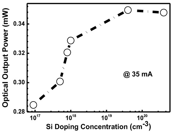 Optical output power for DUV LED structures with different Si doping concentrations in the X region. Data are collected at the injection current level of 35 mA.