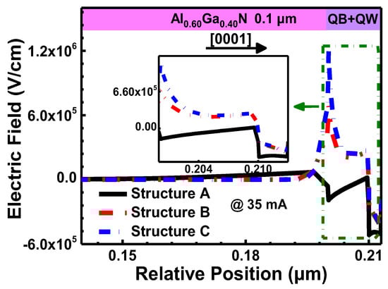 Electric field profiles in the n-Al0.60Ga0.40N layer and the first QB/QW for Structures A, B, and C, respectively, at the injection current of 35 mA.