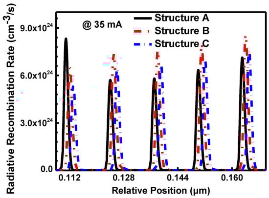 Radiative recombination rate in the MQWs for Structures A, B, and C, respectively. Data are collected at the injection current level of 35 mA.