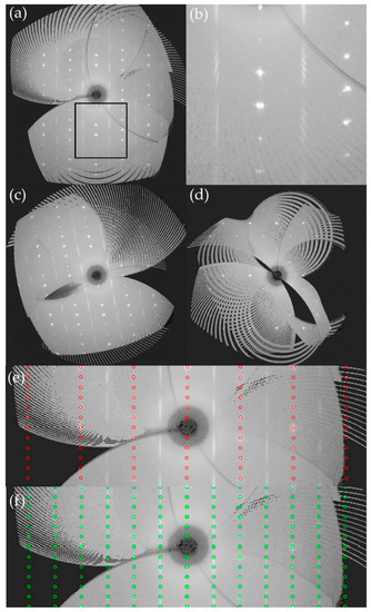 Reconstructed diffraction pattern of SrLi2{Li0.65Co0.35[Co0.65Li0.35N2]} (a) 0kl; (b) Magnified section from marked region in Figure 1a; (c) h0l; (d) hk0; (e) 0kl with superimposed reflections for a tetragonal lattice (red); (f) 0kl with superimposed reflections for a monoclinic lattice (green).