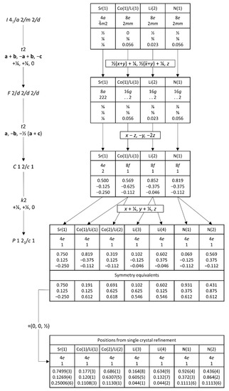 Single crystal structural refinement of SrLi2{Li1–xCox[Co1–x LixN2]} in the space groups I41/amd (subcell) and P21/c (supercell).