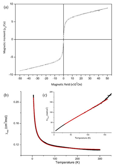 The presence of Co(I) cations along the chains gave rise to the question on the spin-state and possible magnetic ordering. Measurements of the magnetization were conducted, using the identical crystal from the single crystal X-ray diffraction experiments, with a varying magnetic field (Figure 4a) and varying temperature (Figure 4b). The shape of the hysteresis and relation of magnetic susceptibility to temperature shows a Curie-Weiss paramagnetic behaviour and no indication of long-range ordering at low temperatures.