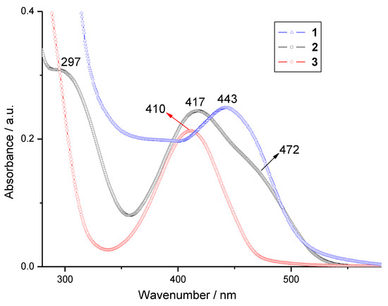 The UV–vis spectra of the MnIII complexes 1, 2, and 3 were recorded in 1.0 × 10−5 mol·L−1 DMF solution at room temperature shown in Figure 1.