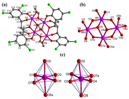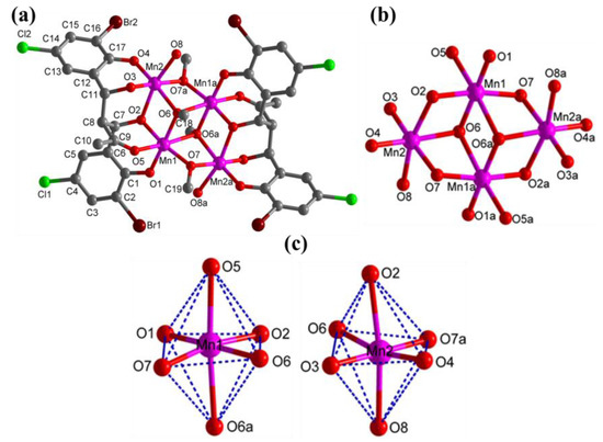 There is a wide range of research space in aldol condensation reactions, in particular, in its asymmetric and catalytic field, via an asymmetric organic catalyst or chelating agent of the metal complex unit. Normally, the B, Ti, or Sn ions because of their specific Lewis acid properties are used for promoting enolization followed by aldol addition [1,2,3]. To a lesser extent, the other first row of transition metal Zr, Co, Ni, Cu, or Zn ions also have been used [4,5,6]. In addition, we have recently reported a tetranuclear ZnII complex using a double aldol ligand formed in situ by α,α-double aldol addition of acetone to 3,5-dichlorosalicylaldehyde promoted by ZnII ion in the presence of base [7]. In efforts to design new multidentate ligands which can form novel polynuclear complexes with attractive structural features, we are probing into this reaction using Lewis acid metal assistance. This favorable reaction will allow to obtaining ligands that are extremely difficult to separate by classical anionic organic chemistry under conventional conditions. This, in turn, will allow the synthesis of novel-innovative metal complexes that are pre-restricted by ligand design [8,9,10,11,12,13,14,15,16,17]. Based on this, the transition metal Mn ion has become our target of choice due to its various oxidation states and Lewis acidity [18], which acts as a potential promoter to study the extent of the in situ aldol reaction of acetone and salicylaldehyde derivatives. Up to now, the use of Mn ions for the synthesis of aldol products has been relatively little explored, as reported, a unique one-pot α,α-double aldol addition of acetone to two o-vanillin molecules promoted by Mnn+ ions in situ, leading to a novel multidentate ligand, further obtained a rare defect-dicubane {Mn4} complex [19]. Therefore, we hope that we can synthesize a variety of multinuclear Mn complexes, explore the spatial structure and crystal parameters, and perhaps determine the laws.